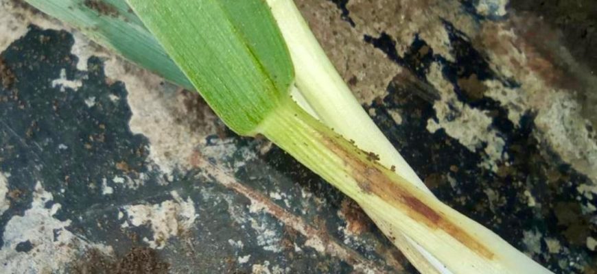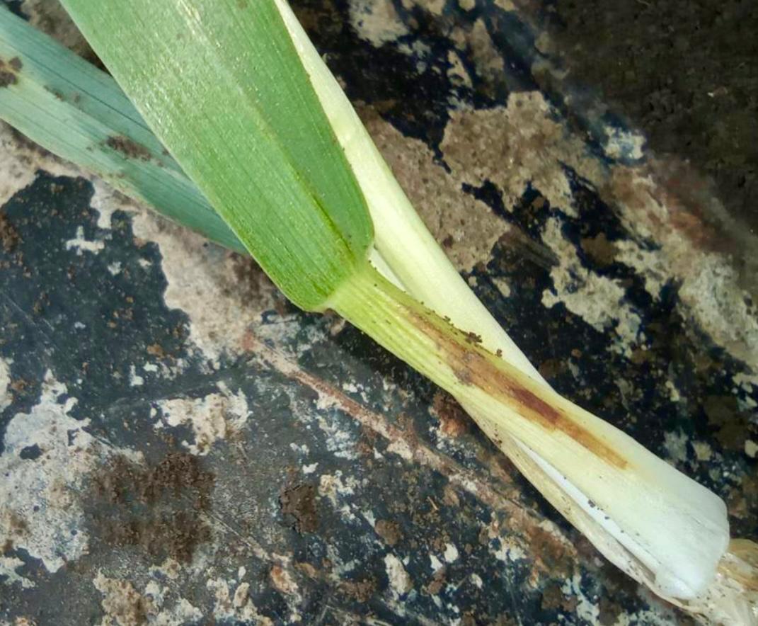 Озимый ячмень сейчас находятся в фазе середины кущения, листовая инфекция выявлена на втором и третьем листьях в виде единичных пятен. Относительно тёплая погода с повышенной влажностью способствует развитию и распространению данной болезни на посевах.