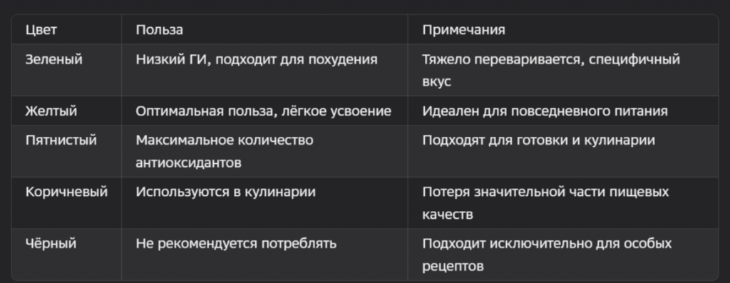Итак, выбирая банан, ориентируйтесь на тот цвет, который соответствует вашим целям и состоянию здоровья. Желаем вам наслаждаться пользой и вкусом этого удивительного фрукта каждый день!