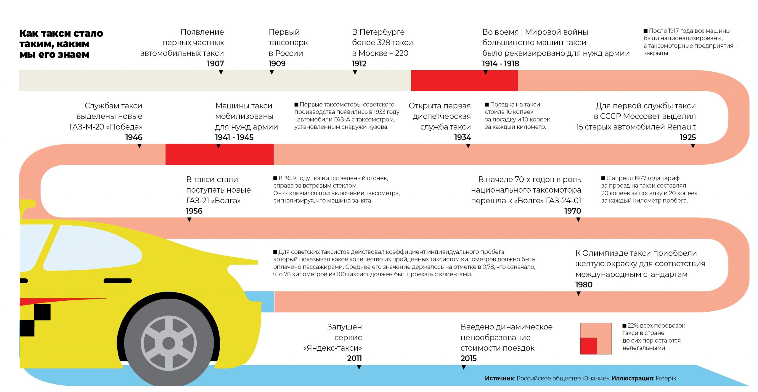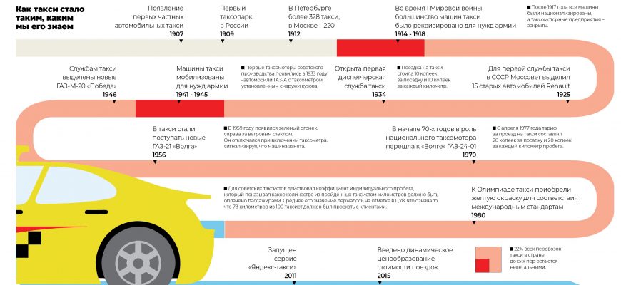 1909 год — в Москве открылся первый таксопарк, положивший начало развитию отрасли в России. В СССР служба такси активно развивалась: