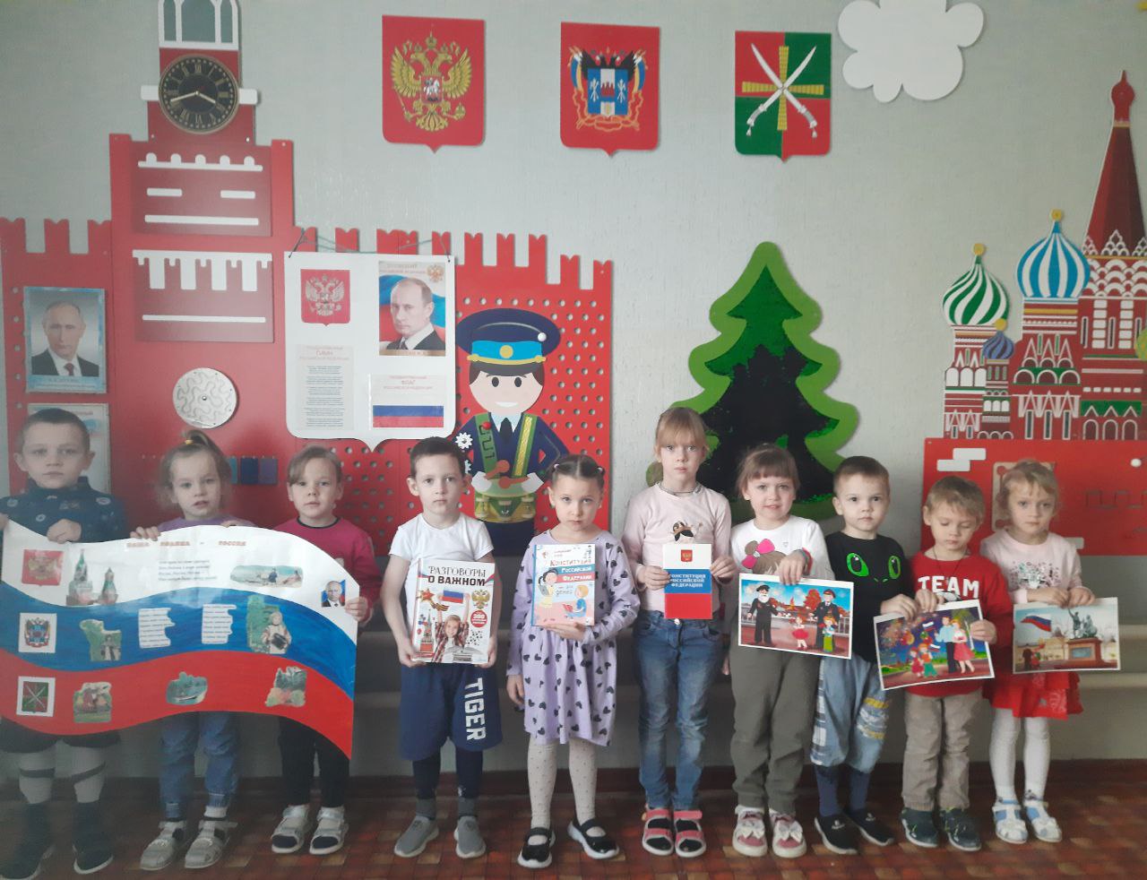 Уже в дошкольном возрасте мы знакомим детей с основными положениями Конституции, воспитываем любовь, уважение и гордость к Родине, государственным символам, прививаем начальные правовые знания, формируем правовую культуру посредством занятий и праздничных мероприятий. Воспитываем достойных граждан нашего великого Отечества!