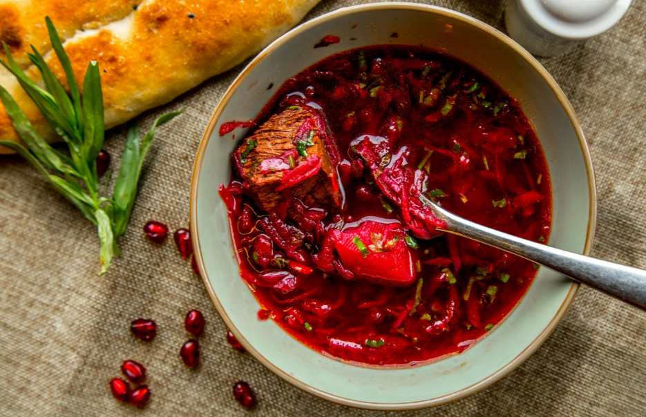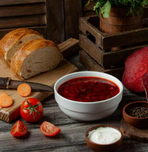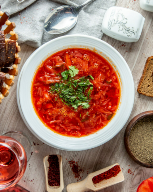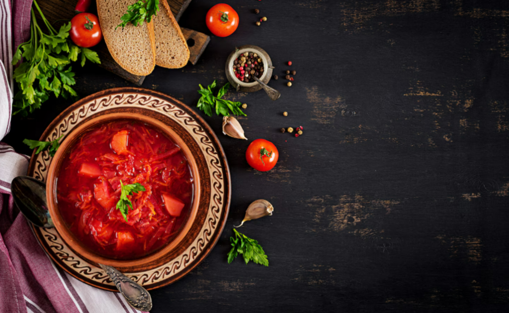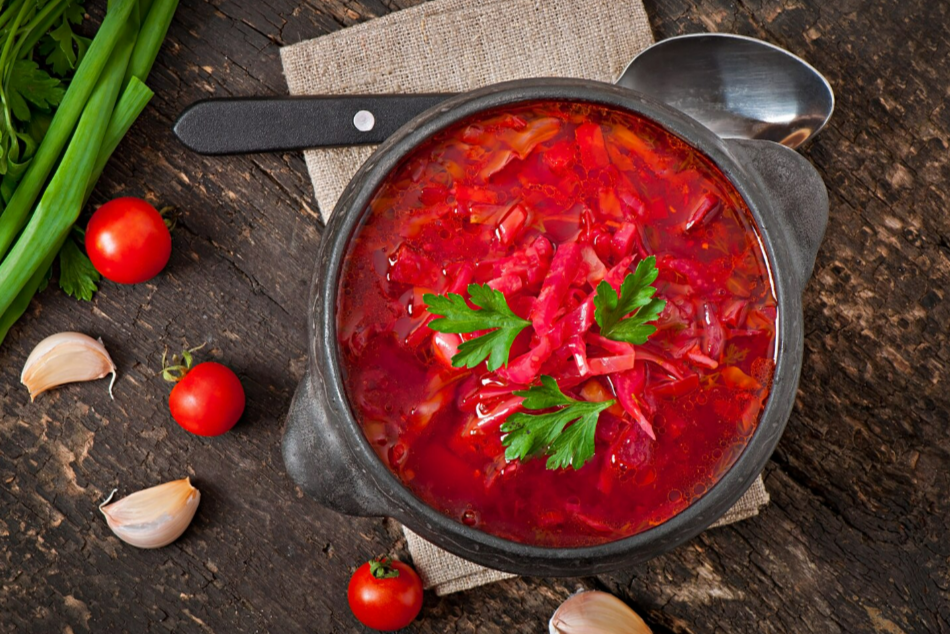 Данный рецепт является ключевым в российской кухне. Основные ингредиенты включают свёклу, капусту, картофель, морковь, лук, чеснок, томатную пасту и мясо (чаще всего свинину). Особенностью украинского борща является использование сала и чеснока, придающих особый аромат и пикантность.